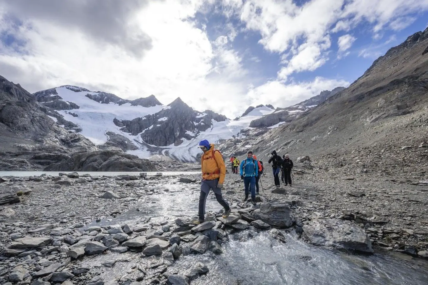 Este imperdible trekking comienza en la base de los Montes Martial, en plena Cordillera de los Andes, donde en invierno funciona el centro invernal del Martial. Allí inicia nuestra aventura por una senda que transita eternos bosques nativos y bordea un arroyo de deshielo que desciende del mismo glaciar, mientras aprendemos sobre el paisaje, su fauna y geografía. Después de una hora de ascenso, repentinamente el paisaje empieza a transformarse: los árboles se vuelven más enanos y el clima más frío nos indica que, a 600 metros sobre el nivel del mar, estamos ingresando al ambiente de alta montaña. Dejamos atrás el límite de vegetación, y luego de disfrutar de un hermoso ambiente andino, se nos presenta la parte desafiante del camino. En este sector predominan los musgos, líquenes y solo algunas aves que se adaptan a este ambiente. Nos tomamos un pequeño descanso para apreciar las vistas desde el lugar y emprendemos el último ascenso para llegar al final del sendero. En este punto sentimos la majestuosidad del Glaciar Martial y las montañas que nos rodean. Caminamos por la zona buscando los mejores lugares para las fotos y recargamos energías antes de comenzar el descenso a la base.
