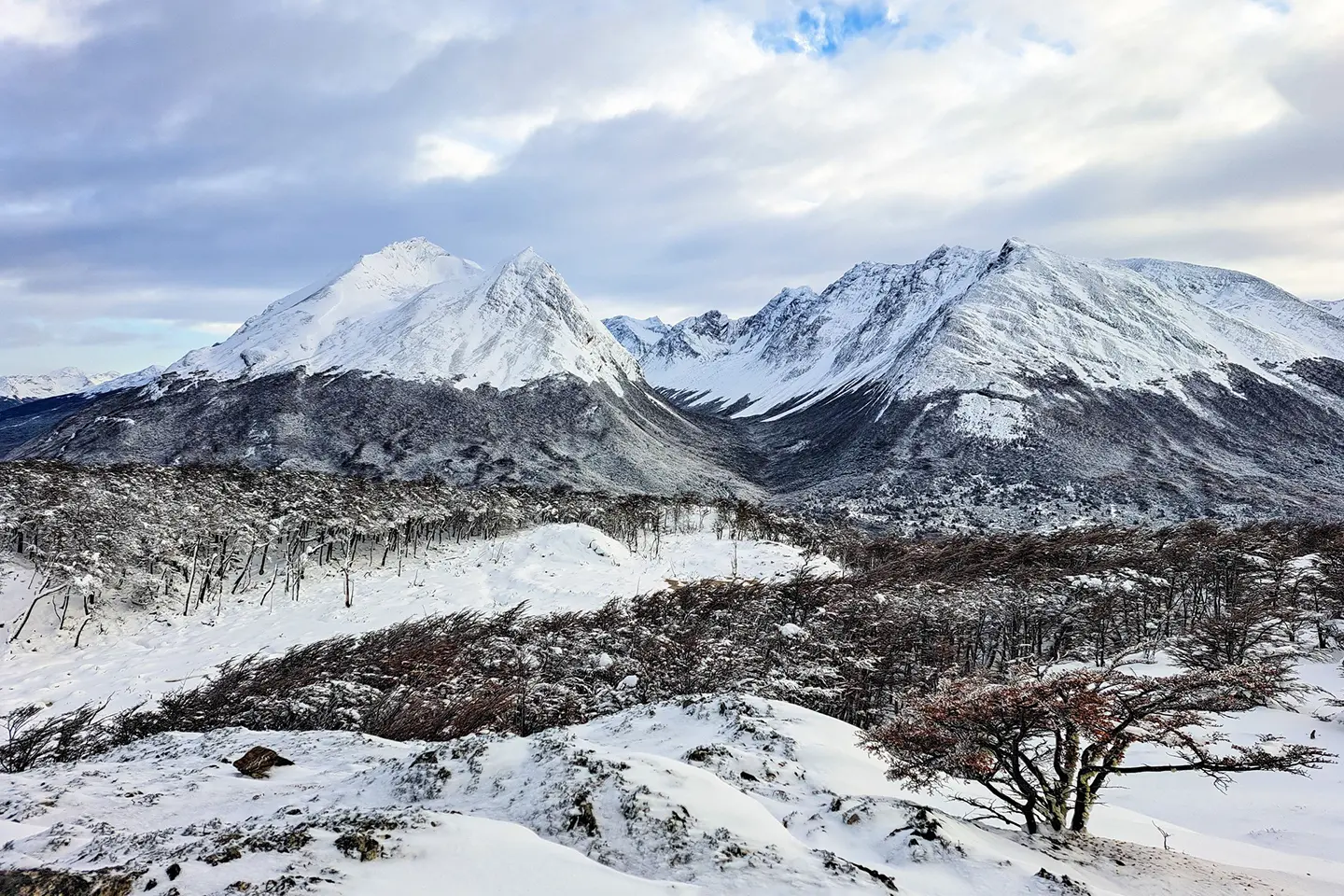 Saliendo de la costa del Canal Beagle el trekking al Monte Susana nos lleva a la cumbre misma de una montaña en plena Cordillera de los Andes. Podremos obtener las mejores vistas de la ciudad de Ushuaia, el Canal Beagle y de los cordones montañosos que nos rodean, tanto del lado argentino de la isla como del lado chileno. Ya en los primeros metros de caminata entramos al bosque nativo, donde podremos conocer las diferentes especies de plantas que conforman este ambiente, lengas, canelos, calafates, orquídeas y muchas más. También, al entrar al bosque, comenzamos con el ascenso que nos llevará hasta la cumbre. Luego de poco más de una hora de caminata en ascenso progresivo llegamos al primer mirador. Ya cerca de la zona de alta montaña notamos cómo poco a poco los árboles comienzan a cambiar presentándose en forma más achaparrada. Aquí ya podemos disfrutar de las primeras grandes vistas que nos regala este cerro, y aprovechamos para tomar un pequeño descanso antes de emprender el último esfuerzo en el ascenso a la cumbre. El sendero que nos lleva a la cumbre ya se encuentra fuera del límite de vegetación. Nos acompañan algunas plantas y rocas cubiertas de líquenes de diversos colores, típicos de la vegetación de alta montaña. Este último trayecto nos demanda un mayor esfuerzo, pero es bien recompensado una vez en la cima. La cumbre ofrece una perspectiva excepcional: se observan diferentes cordones montañosos que componen la Cordillera de los Andes, el grandioso Canal Beagle con sus islas y bahías que lo integran y la ciudad de Ushuaia recostada sobre la costa y al pie de los Montes Martial. Luego de contemplar las maravillosas vistas y disfrutar de un delicioso box lunch comenzamos el regreso hacia la base, con la alegría y satisfacción de haber conquistado una cumbre y pasado un día en pleno contacto con la naturaleza.